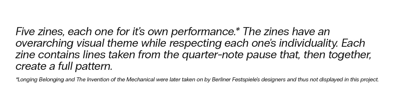 I designed five zines for the 2023 edition of Berliner Festspiele's Maerzmusik. I created the layout and theme for them. The zines have an overarching theme while respecting each one's individuality. It was a freelance gig that took ~2 weeks.